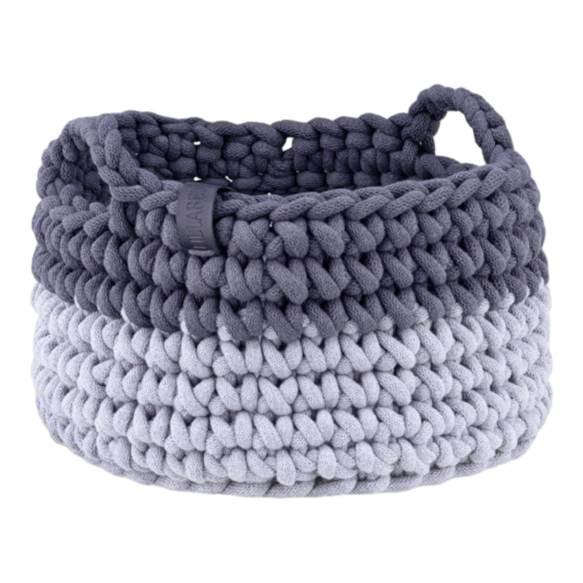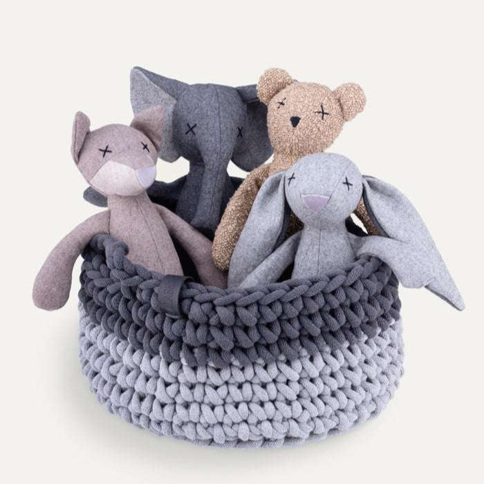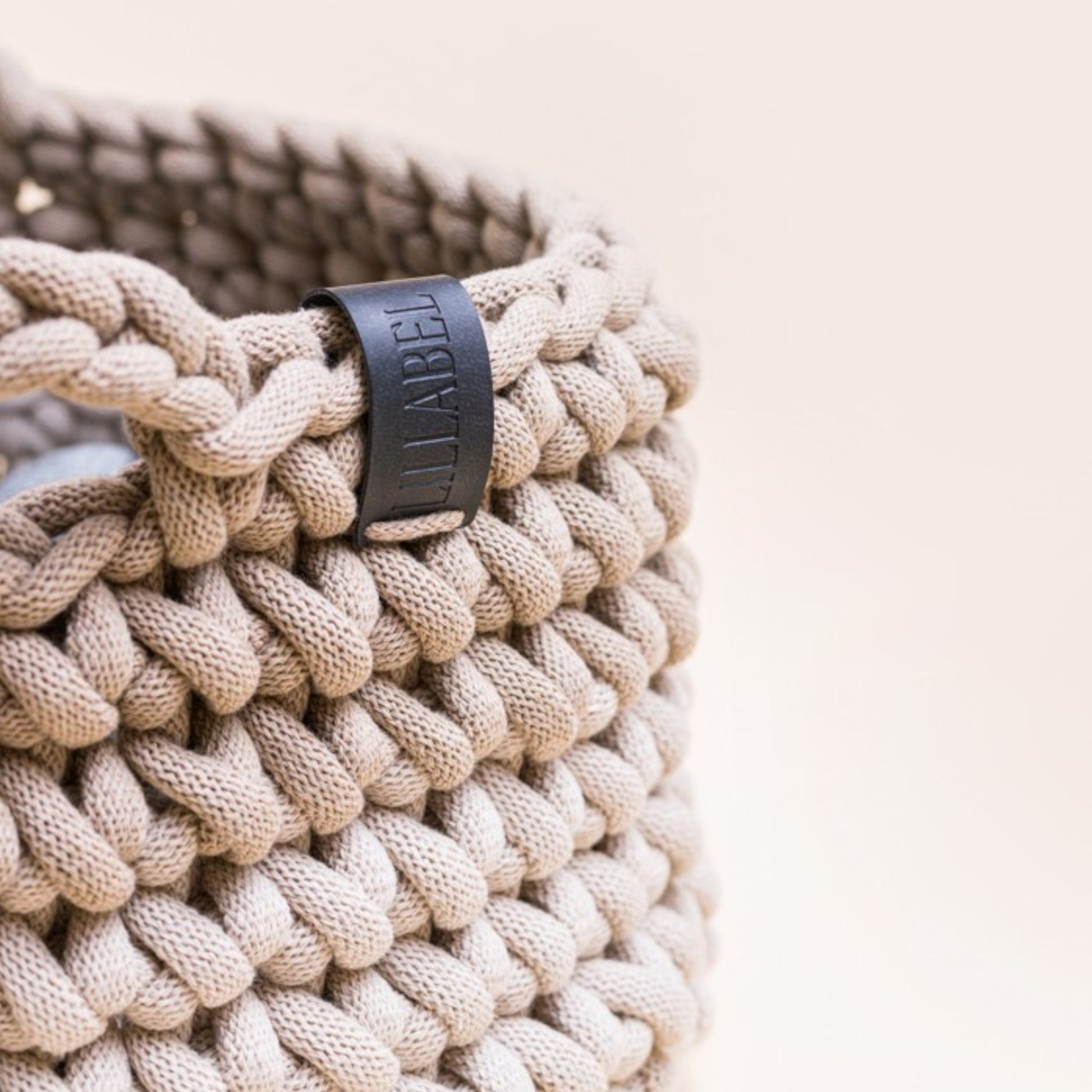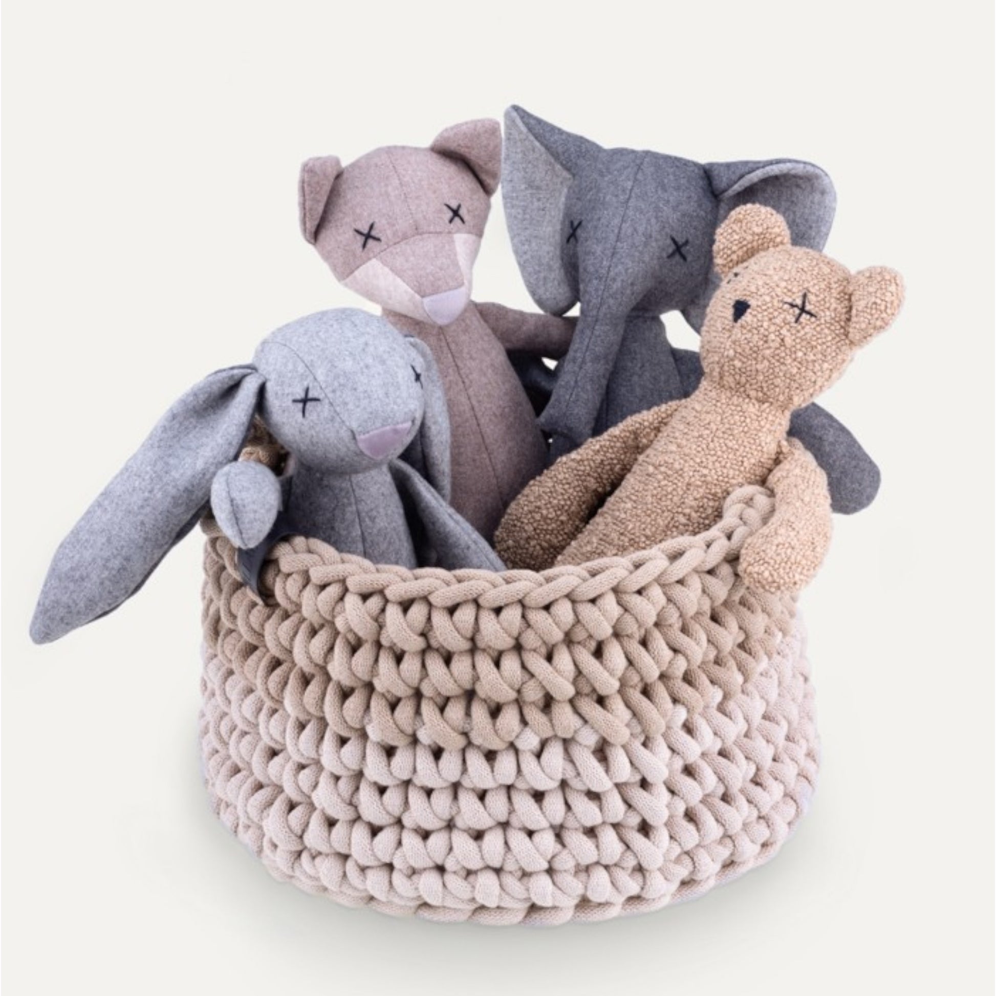 The toy basket is handmade in a Warsaw studio from soft recycled cotton cord with a crochet hook.